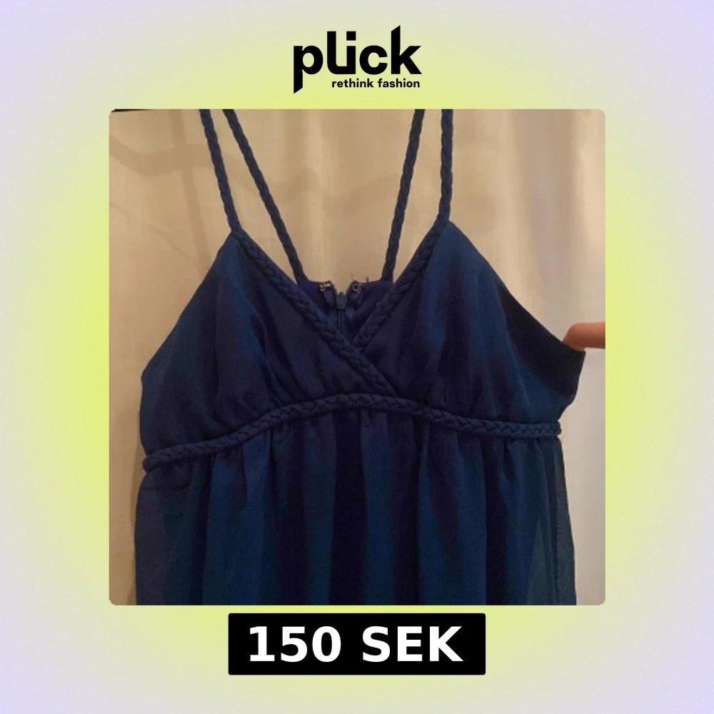 Säljer en elegant mörkblå långklänning med smala, flätade axelband och v-ringad hals. Klänningen har en luftig passform och markerad midja med flätad detalj. Perfekt för sommarens tillfällen ellr bal! 👌