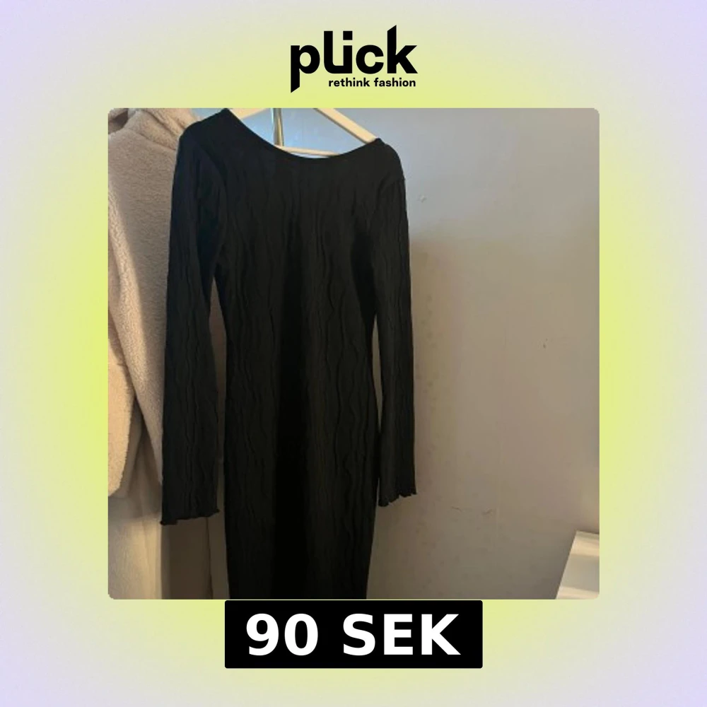 Svart långärmad klänning från SHEIN i storlek M. Klänningen har en vågig struktur i tyget, öppen rygg med knyt och är figurnära. Tillverkad i 100% polyester och har en stilren, enkel look med snygga detaljer i ryggen. (Använts max 2 gånger)