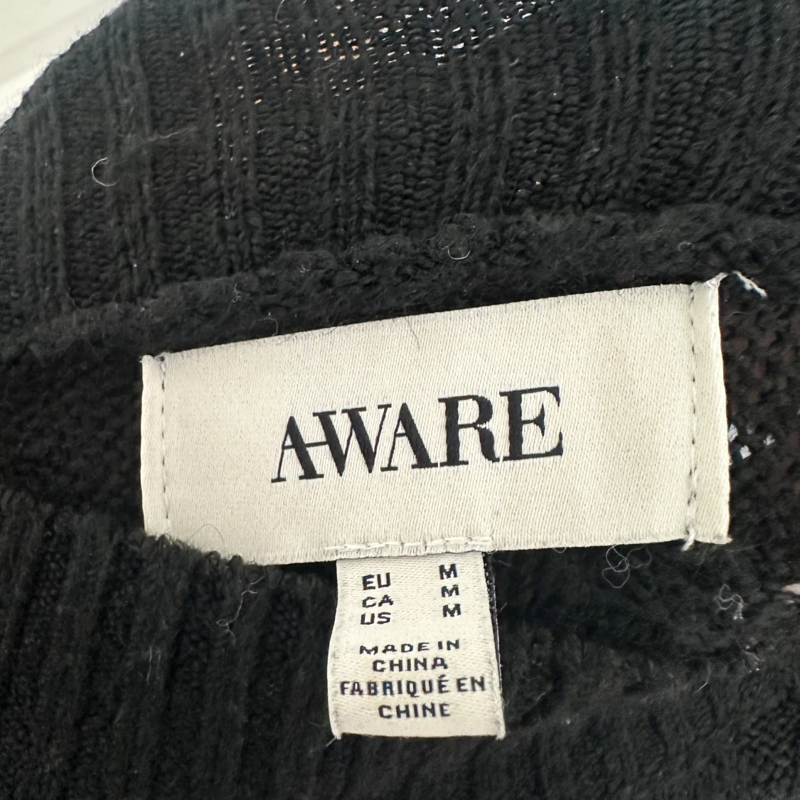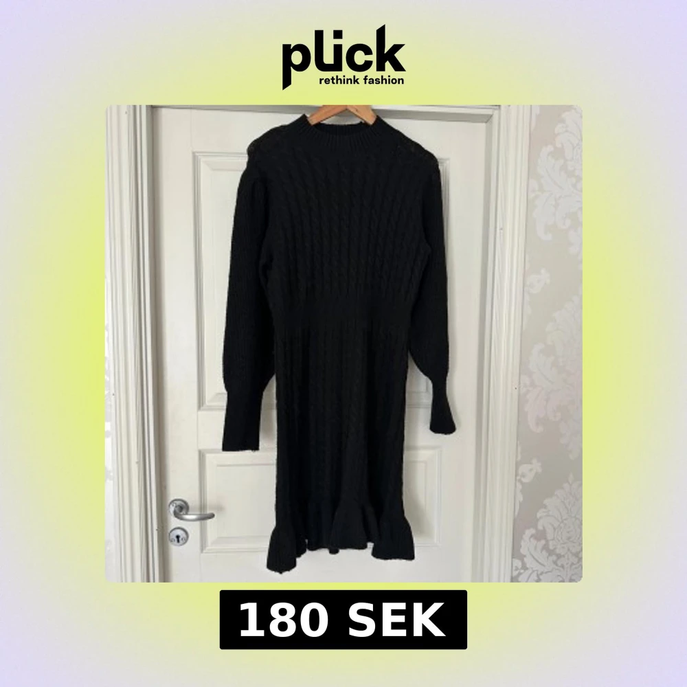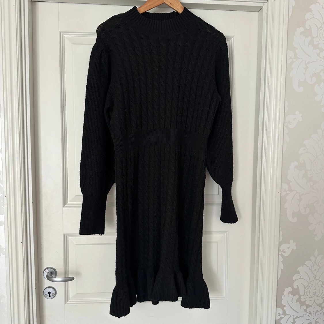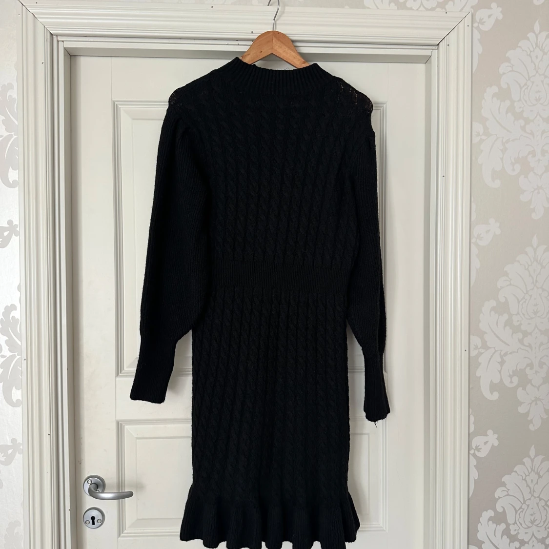 Supersnygg svart stickad klänning från AWARE med kabelstickat mönster och volangkant nedtill. Klänningen har lång ärm, rund hals och markerad midja som ger en schysst siluett. Perfekt höstklänning. Oanvänd, endast provad