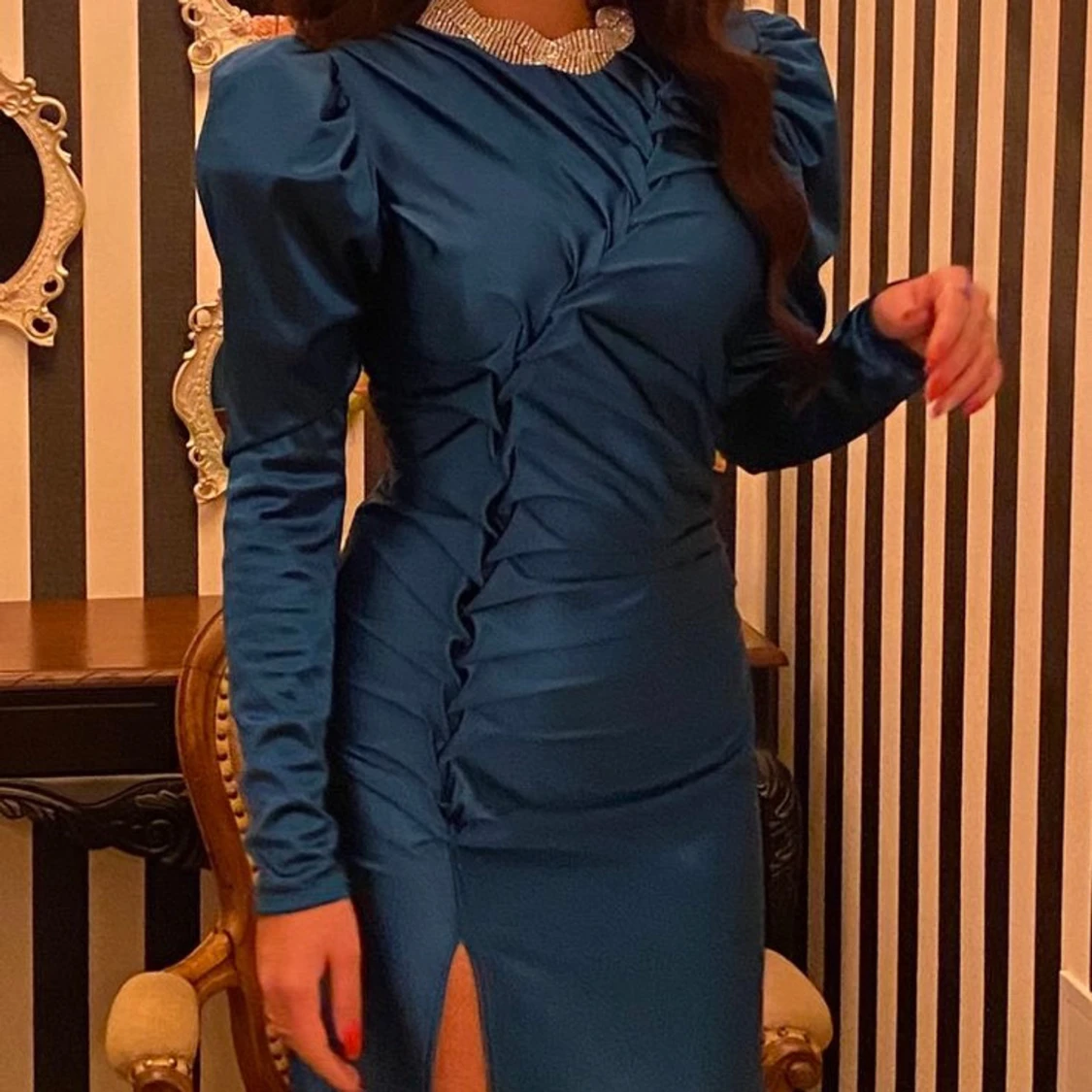 Elegant blå långklänning med långärmad design och en stilfull slits framtill. Klänningen har en glittrig detalj vid halsen och rynkade detaljer som ger en unik look. Perfekt för en glamorös kväll.