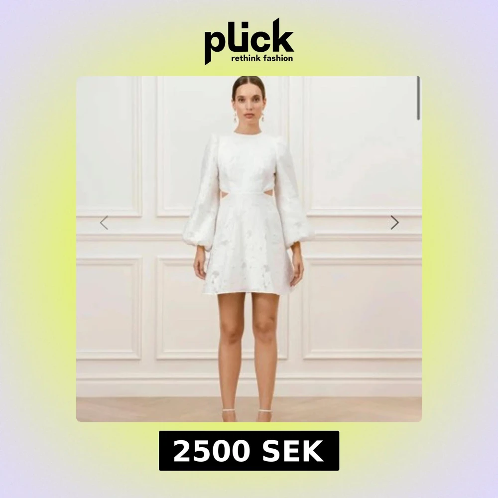 Superfin vit kort klänning med puffiga långärmar och snygga cut-outs i midjan. Klänningen har rund halsringning, öppen rygg och knappar bak. Tyg med subtilt blommönster ger en lyxig känsla. Perfekt för dig som vill sticka ut med en trendig look. Ny pris 5000