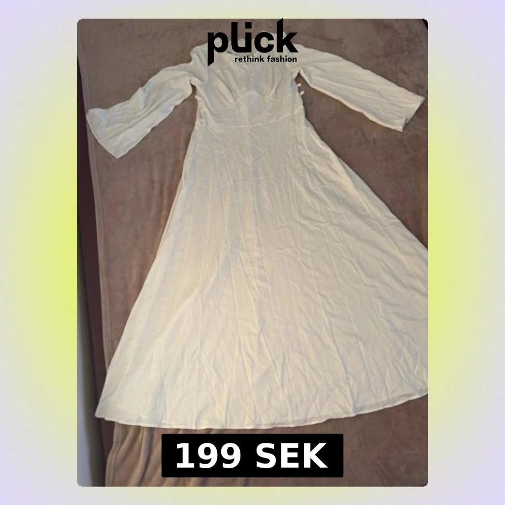 Säljer en elegant vit långklänning med rund halsringning och långa, lätt utsvängda ärmar. Klänningen har en markerad midja och är tillverkad i ett mjukt, slätt material som ger ett fint fall. Dragkedja i ryggen för enkel påklädning.