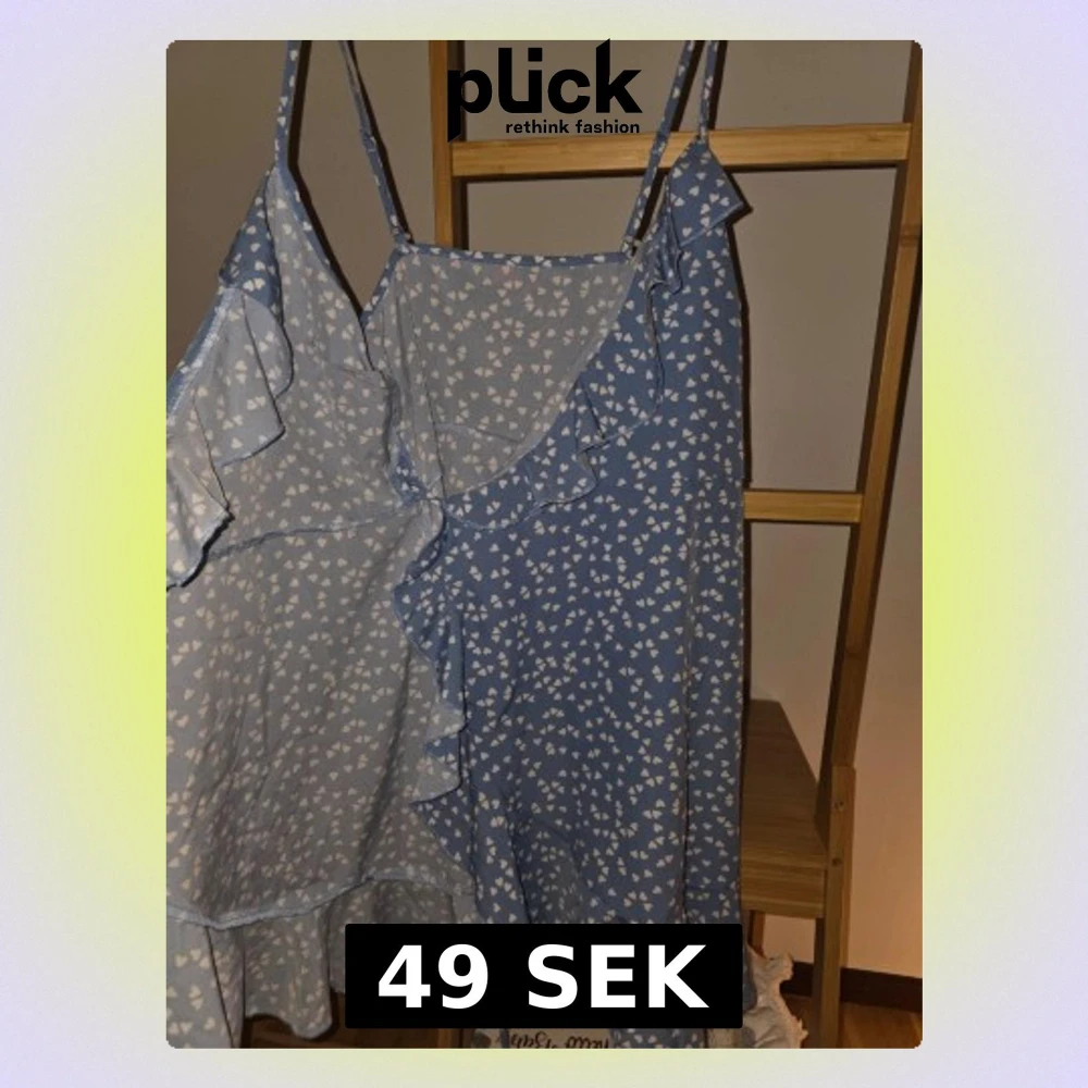 Söt blå omlottklänning med vita hjärtan, tunna axelband och volangdetaljer längs kanterna. Klänningen har knyt i midjan och är i en kort modell, perfekt för sommarens varma dagar.