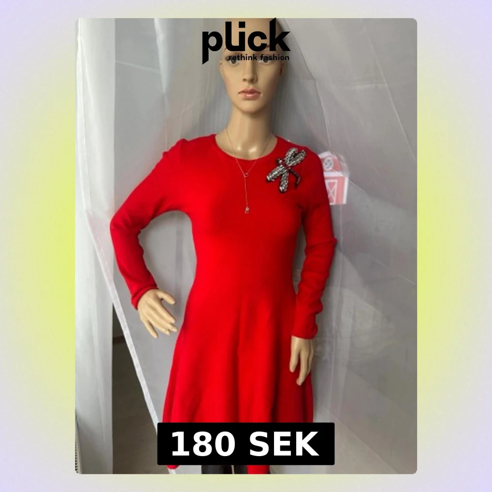Superfin röd stickad klänning med lång ärm och rund hals. Klänningen har en snygg passform och är dekorerad med en stor brosch i form av en trollslända med glittrande stenar på axeln. Perfekt för dig som vill sticka ut lite extra.