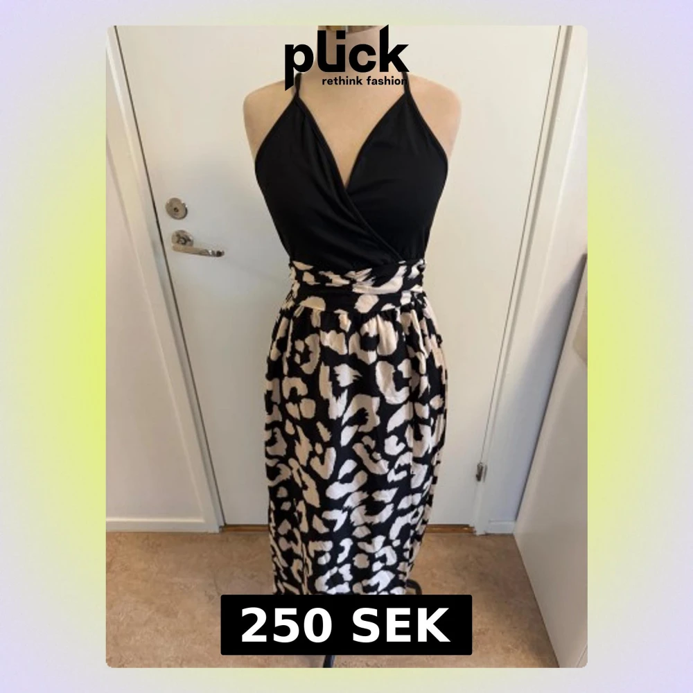 Snygg långklänning från Shein med svart omlottliv och smala axelband. Kjolen har ett beige och svart leopardmönster som ger en cool kontrast. Klänningen är tillverkad i polyester och har en figurnära midja med lätt rynk. Perfekt för dig som vill sticka ut.