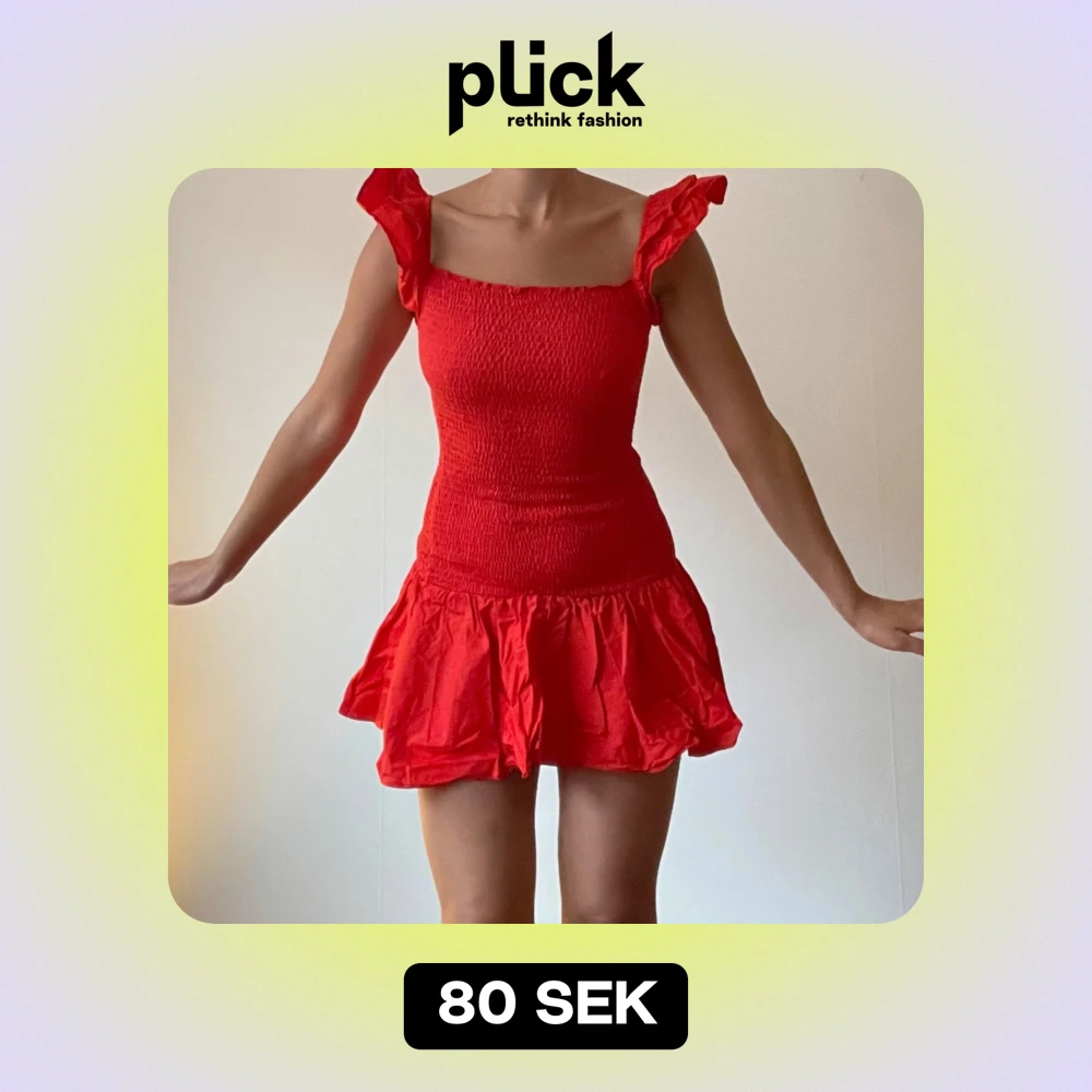 Säljer en superfin röd klänning perfekt för sommaren! Den har en tight passform upptill med smock och volangdetaljer på axlarna. Kjolen är kort och har en härlig volangkant. Perfekt för både fest och vardag. 🥰