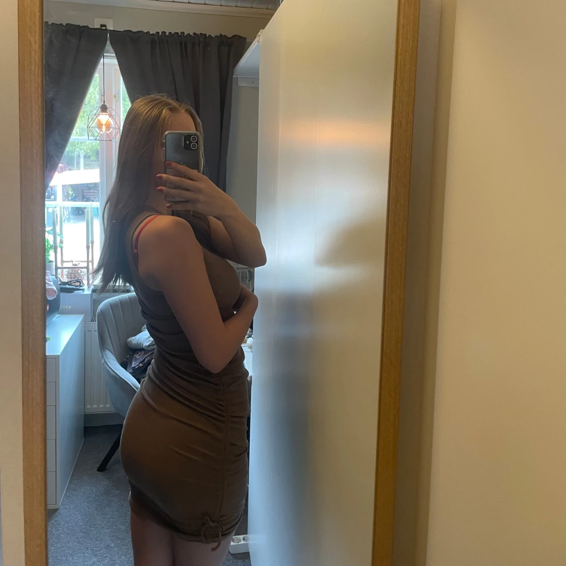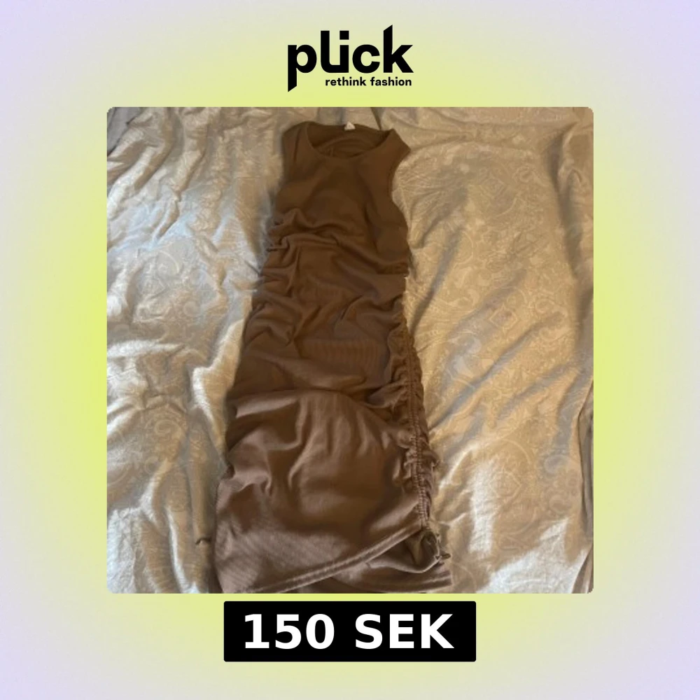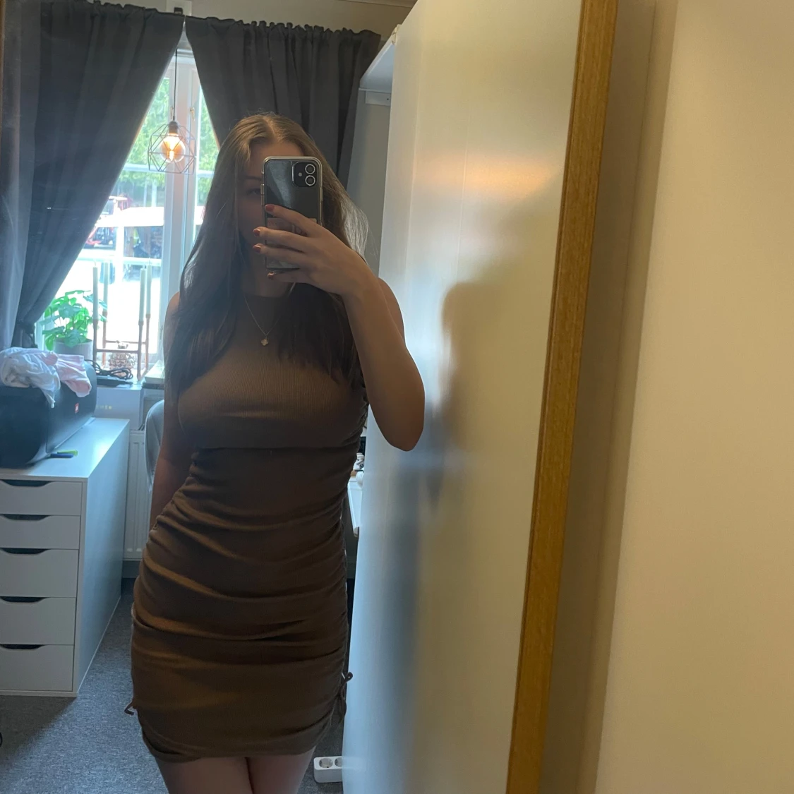 Snygg brun ärmlös klänning med rynkade detaljer på sidorna. Perfekt för en stilren look. Klänningen har en tight passform och är gjord i ett mjukt material. Mycket stretchig.