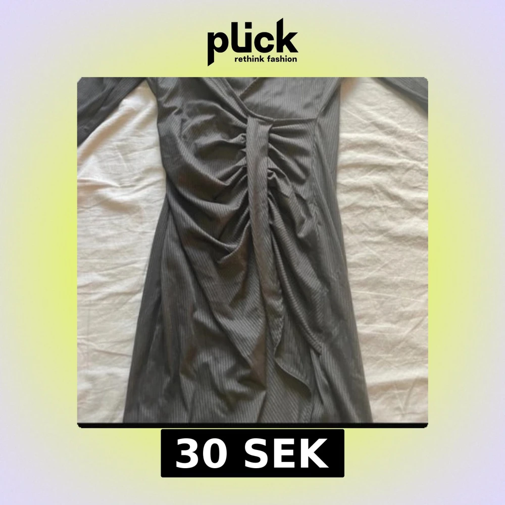 Snygg grå omlottklänning med smala ränder och knyt i midjan. Klänningen har v-ringning och ett fint fall. Perfekt för dig som gillar stilrena plagg med en twist.
