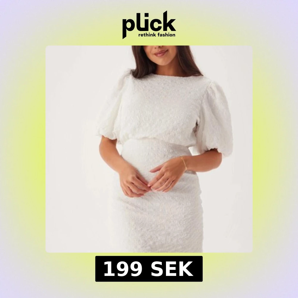 Superfin vit studentklänning med puffärmar och snygg rosettdetalj i ryggen. Klänningen har en strukturerad yta och markerad midja. Använd en gång 😀Skulle säga att det är en stor M