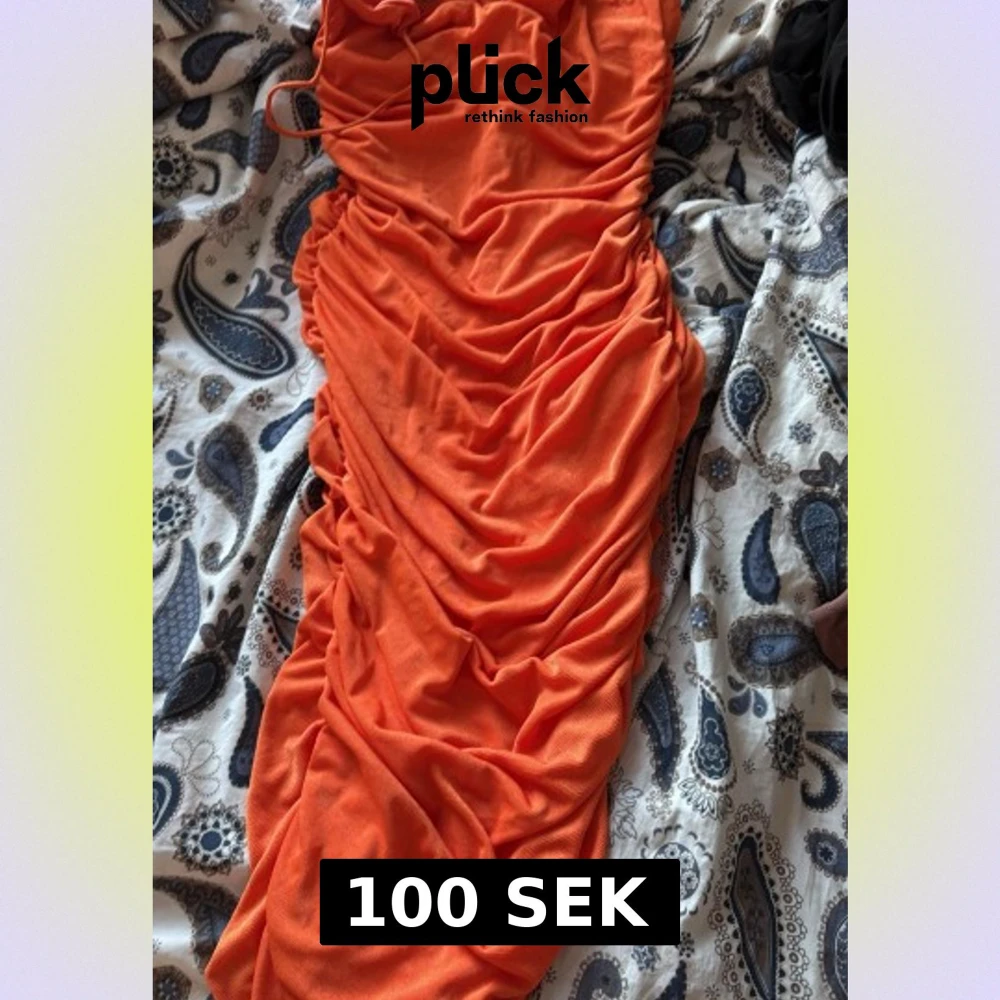 Säljer en snygg orange långklänning med tunna axelband och rynkade detaljer längs hela klänningen. Klänningen har en figurnära passform och är tillverkad i ett mjukt, stretchigt material som känns bekvämt mot huden. Perfekt för dig som vill sticka ut.