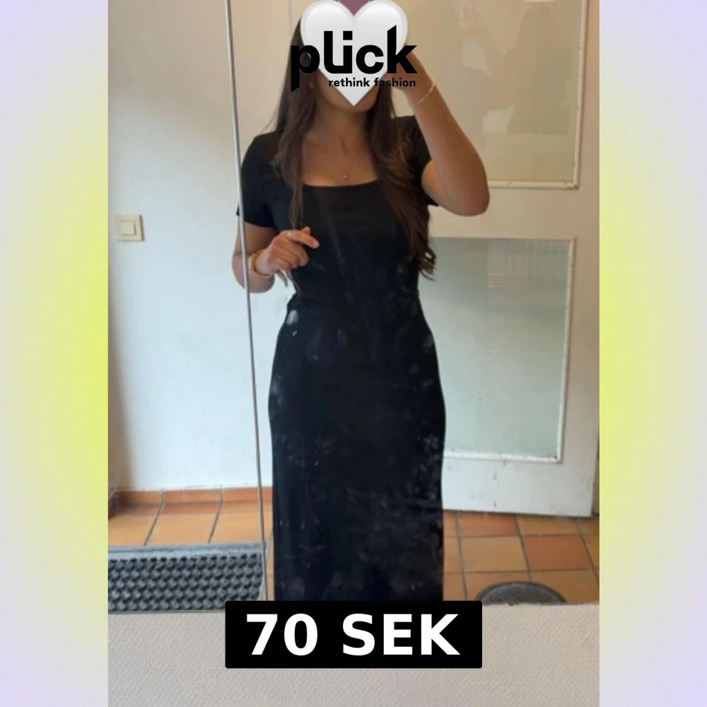 Säljer en svart långklänning med korta ärmar och fyrkantig urringning. Klänningen har snygg snörning i ryggen som ger en fin detalj och figurnära passform. Materialet är mjukt och följsamt, perfekt för dig som gillar stilrena och enkla plagg med en twist.