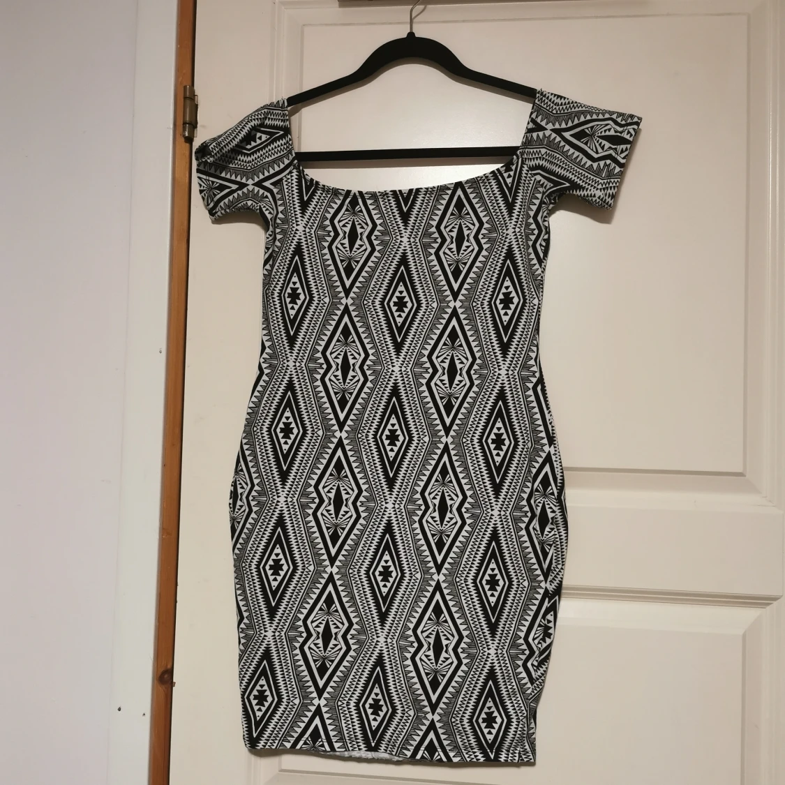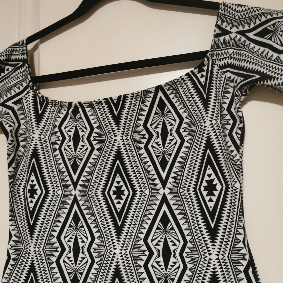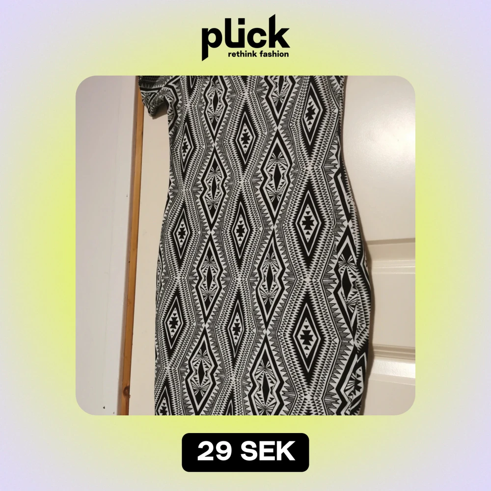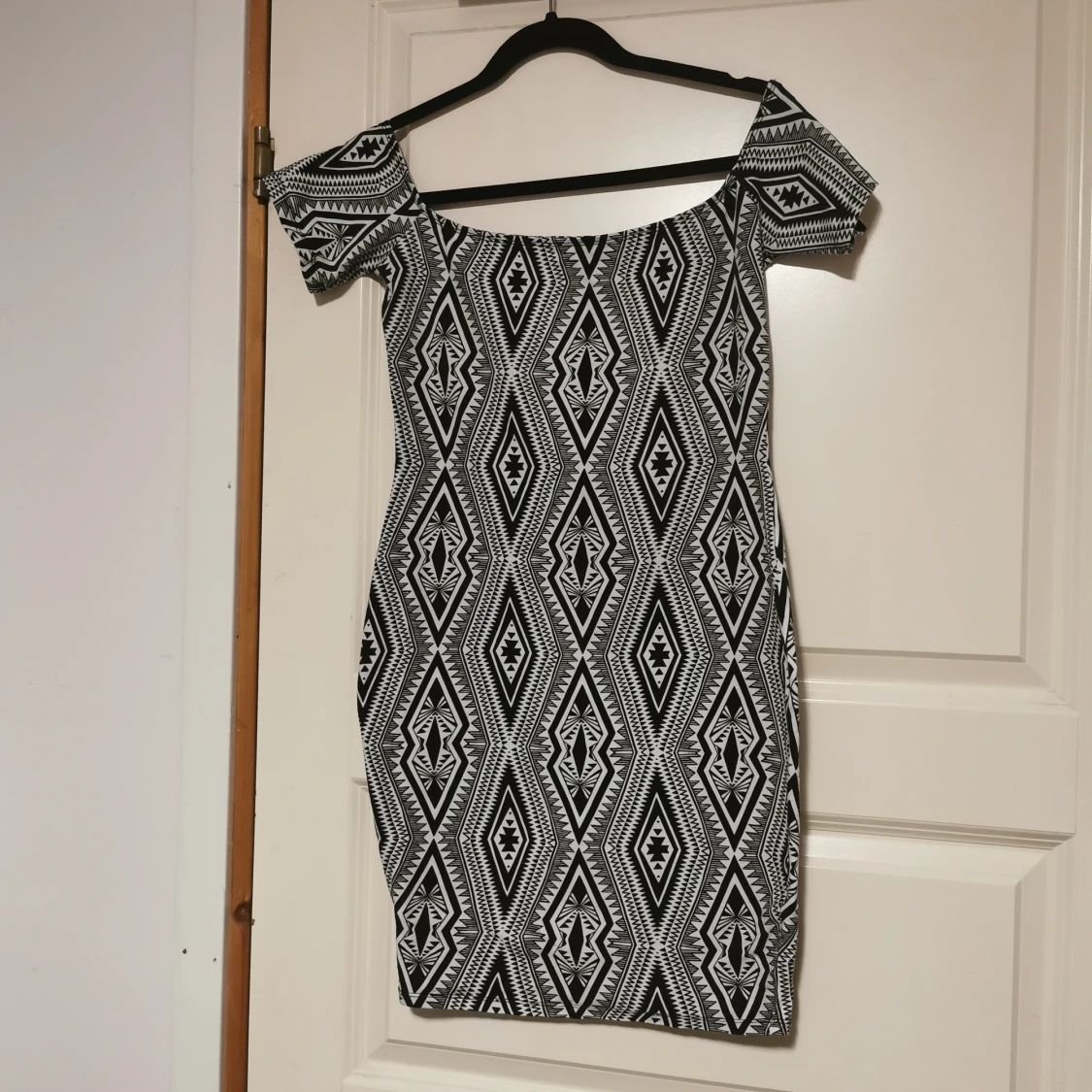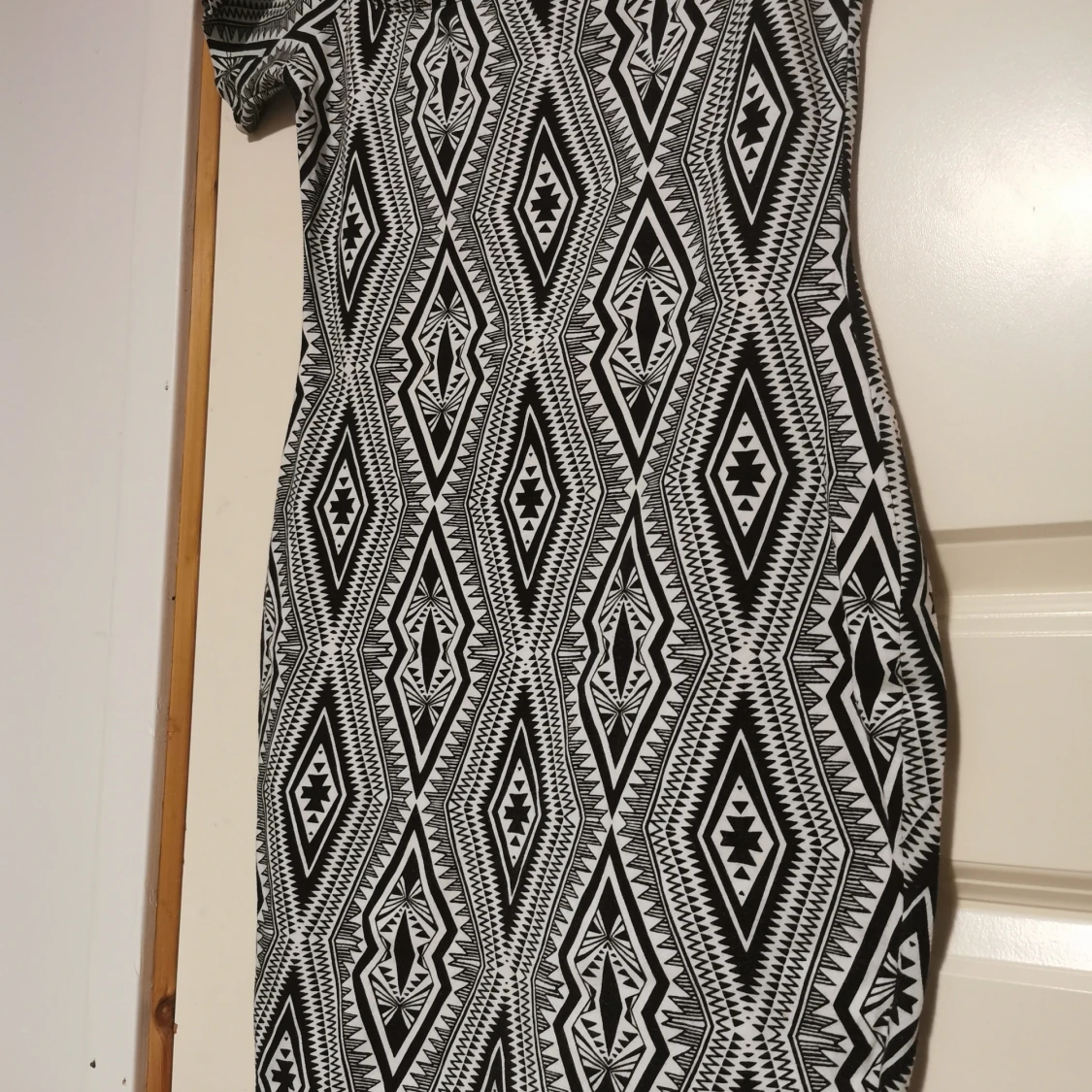 Säljer en superfin svartvit klänning med geometriskt mönster. Den är kortärmad och har en tight passform som framhäver figuren. Perfekt för både vardag. 🖤🤍