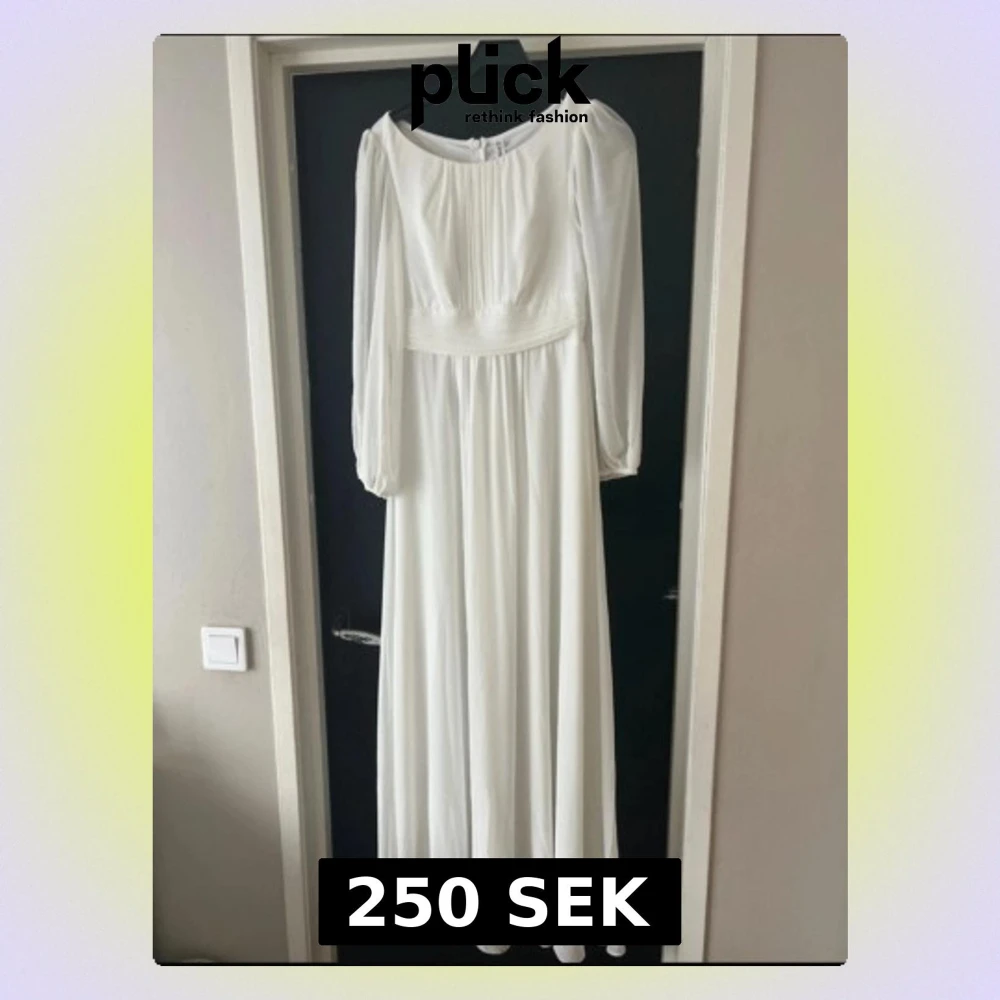 Säljer en elegant vit långklänning i storlek M. Klänningen har långärmade puffärmar, rund halsringning och smockad midja som ger en snygg siluett. Materialet är mjukt och faller fint, perfekt för dig som gillar klassisk och stilren look.