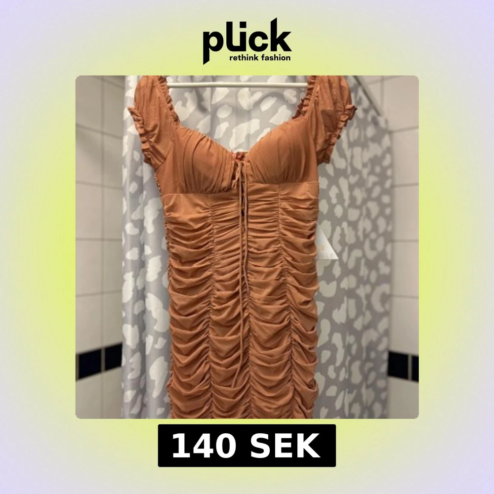 Snygg brun klänning från Love Triangle med rynkade detaljer och korta ärmar. Den har en åtsittande passform och en söt knytning framtill. Perfekt för en stilfull look.