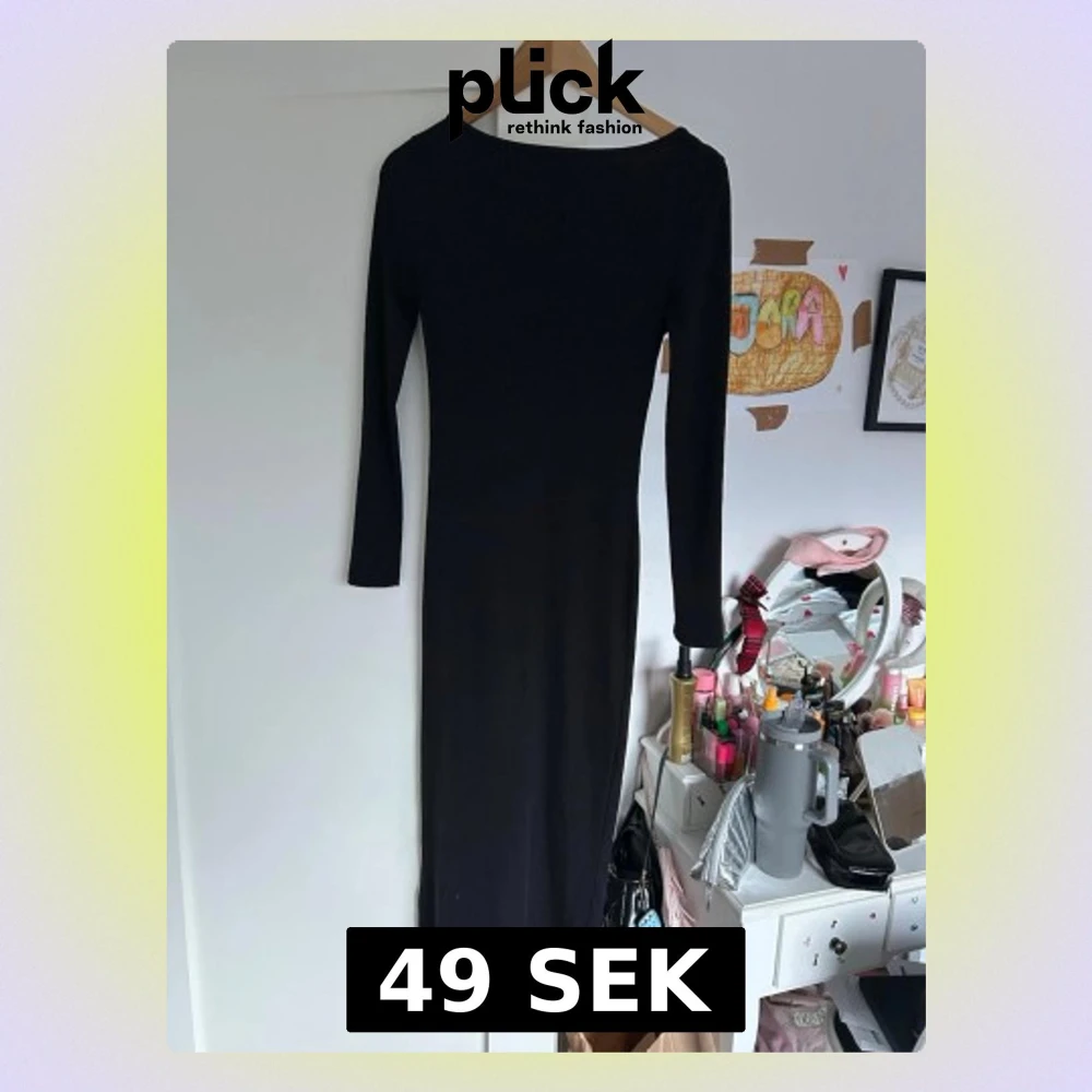 En stilren svart långklänning med långa ärmar och rund halsringning. Klänningen har en smal passform och är gjord i ett mjukt, stretchigt material som sitter snyggt på kroppen. Perfekt för dig som gillar minimalistisk och klassisk stil.