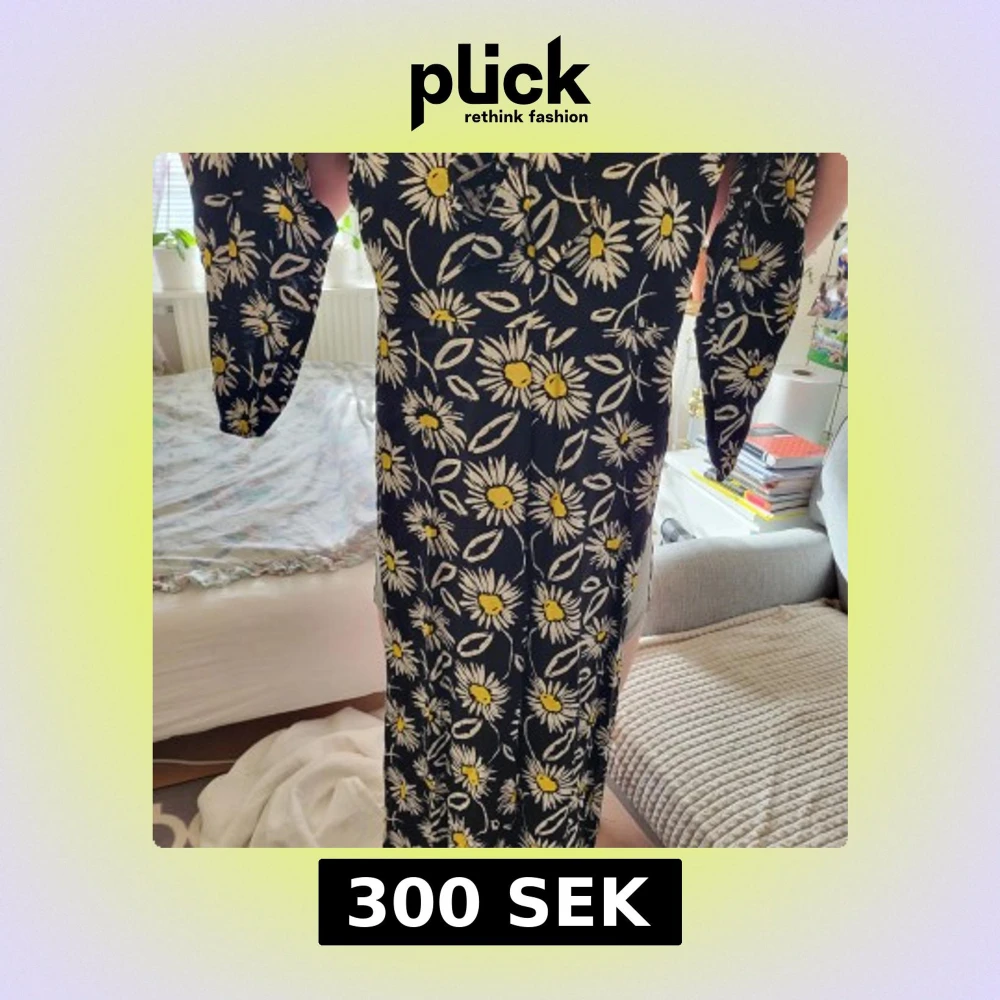 Snygg svart klänning med ett härligt blommönster av solrosor i gult och vitt. Klänningen har långa ärmar och en figurnära passform som framhäver silhuetten. Perfekt för en somrig look!
