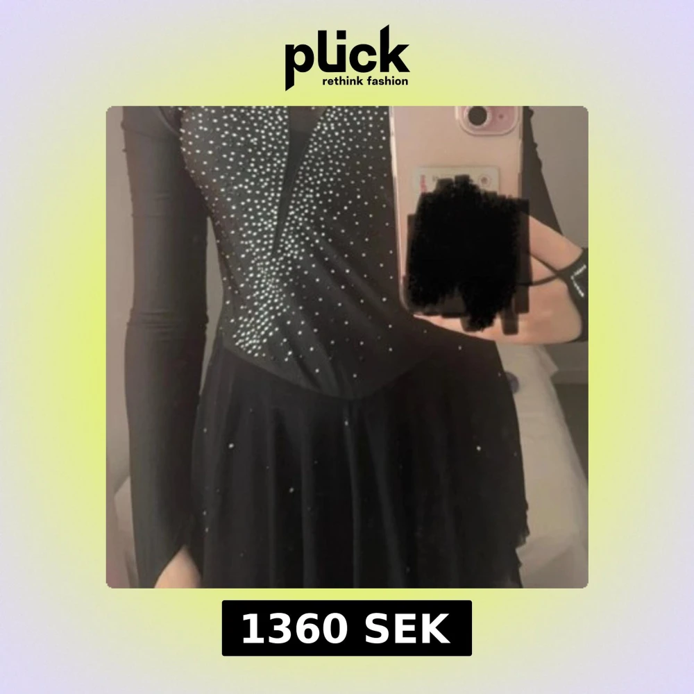 Svart långärmad klänning med glittriga stenar över hela överdelen och ärmsluten. Klänningen har v-ringning och lätt utställd kjol. Materialet är stretchigt, klänningen är i storlek M. Armarna har syts in men de går att sy ut de igen om man vill ha de lite större och lösare. Den har bara använts 1 gång. Mått: bust 80 cm, midja 76 cm, längd 71-85 cm. Passar perfekt om man är 165-170 cm lång
