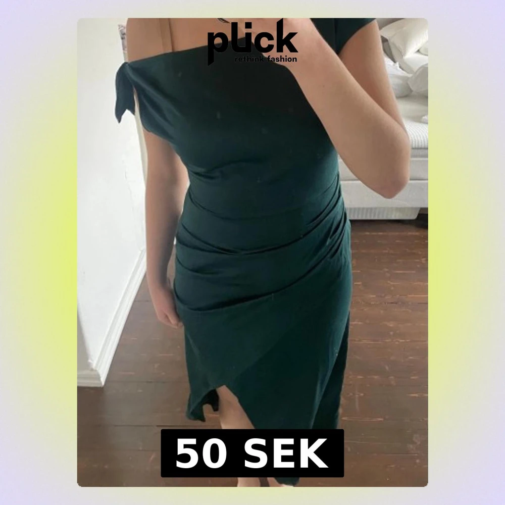 Snygg mörkgrön omlottklänning med offshoulder och knyt på ena axeln. Klänningen har en asymmetrisk nederkant och draperade detaljer längs midjan. Perfekt för dig som vill ha en elegant och trendig look.