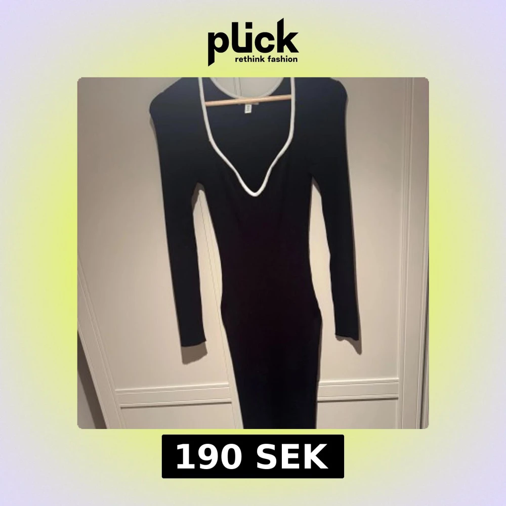 Supersnygg svart långklänning med ribbad struktur och vit kant runt den djupa v-ringningen. Klänningen har lång ärm och figurnära passform som framhäver siluetten. Perfekt för dig som gillar minimalistisk stil med en twist. (Det både en gravid/mamma klänning) använd vid 1 tillfälle.