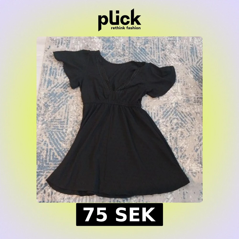 Snygg svart kortklänning med v-ringad hals och dekorativa spetsdetaljer längs ringningen. Klänningen har korta, lite puffiga ärmar och ett mjukt, flowy tyg som ger en skön känsla. Perfekt för dig som gillar enkel men stilren design.