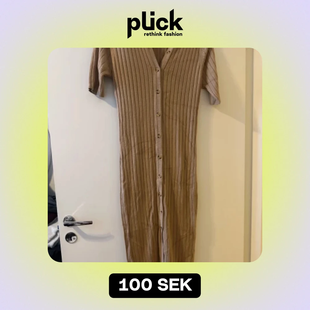 Säljer en superfin beige ribbad klänning från Rut & Circle. Den har en v-ringad design med knappar hela vägen ner och trekvartsärmar. Perfekt för både vardag och fest!