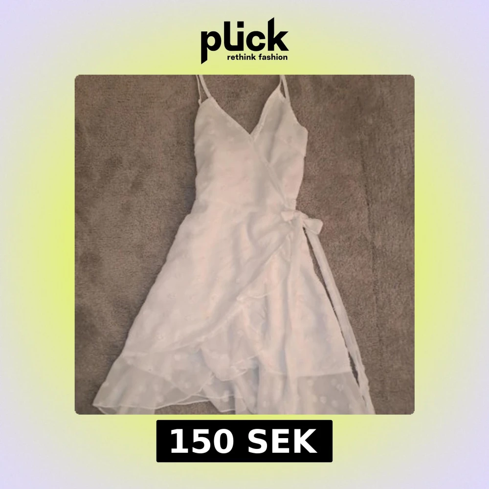 Säljer en söt vit omlottklänning med smala axelband och volangdetaljer. Klänningen har knytband i midjan och är dekorerad med diskreta broderade blommor. Perfekt för sommarens alla tillfällen!