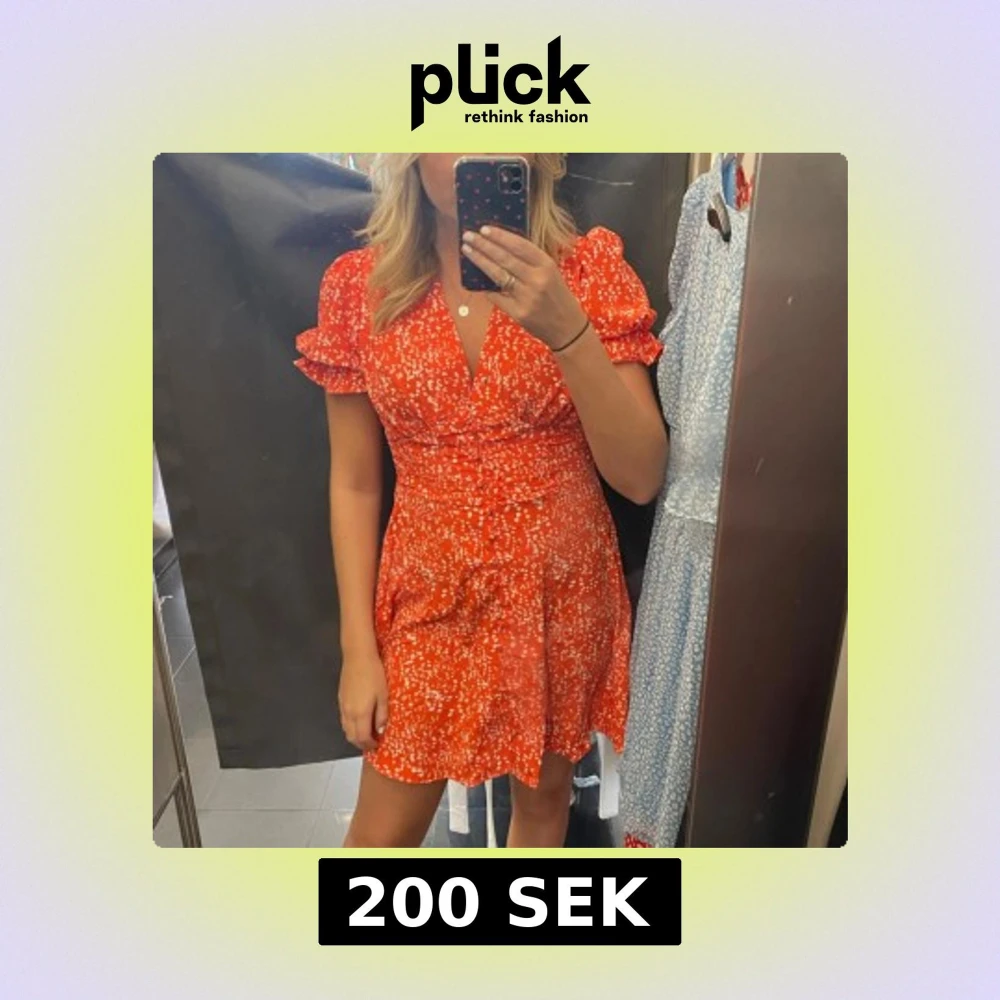 Säljer en söt röd kortklänning med vita blommor och volangdetaljer på axlarna. Klänningen har v-ringning och korta puffärmar. As fin!!!