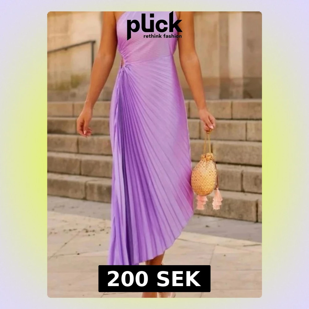 Snygg lila långklänning med plisserad kjol och oneshoulder-design. Klänningen har en elegant asymmetrisk axel och är tillverkad i ett glansigt material som ger en lyxig känsla. Perfekt för dig som vill sticka ut med stilren och modern look.