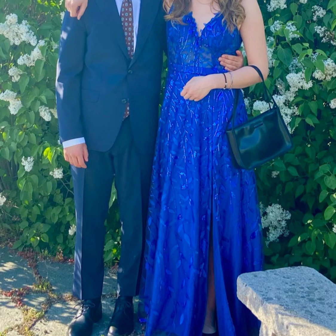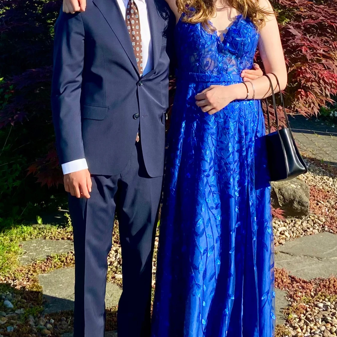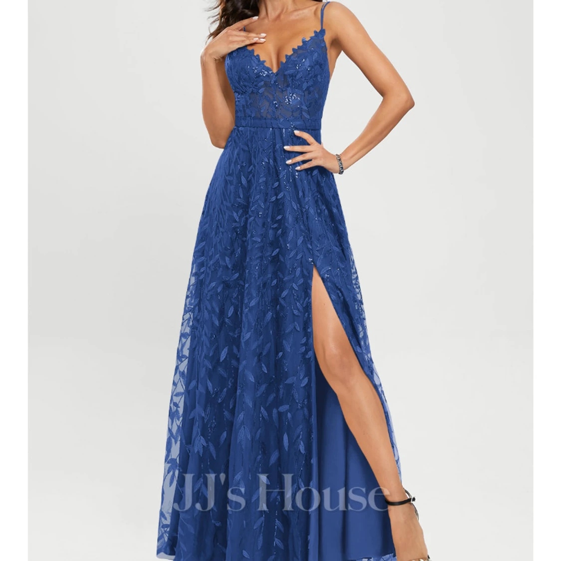 Elegant blå långklänning med smala axelband och v-ringad urringning. Klänningen har spetsdetaljer och en slits. Endast använd en gång.