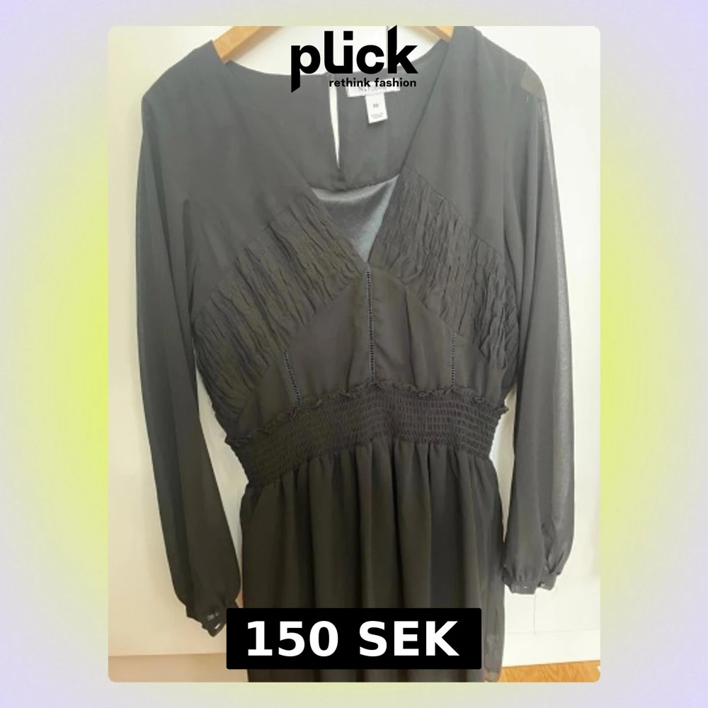 Svart klänning från NLY design med lång ärm och v-ringad hals. Klänningen har smockdetaljer vid midjan och bröstet samt lätt transparenta ärmar. Perfekt för dig som gillar stilrena och klassiska plagg.