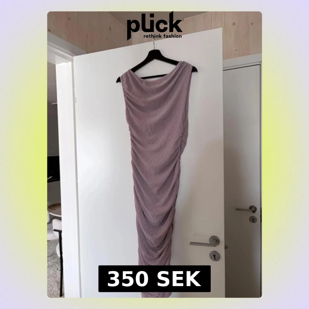 Säljer en snygg ljuslila långklänning med glittrigt tyg och draperad effekt längs hela klänningen. Klänningen är ärmlös och har en elegant, figurnära passform som ger en riktigt trendig look.