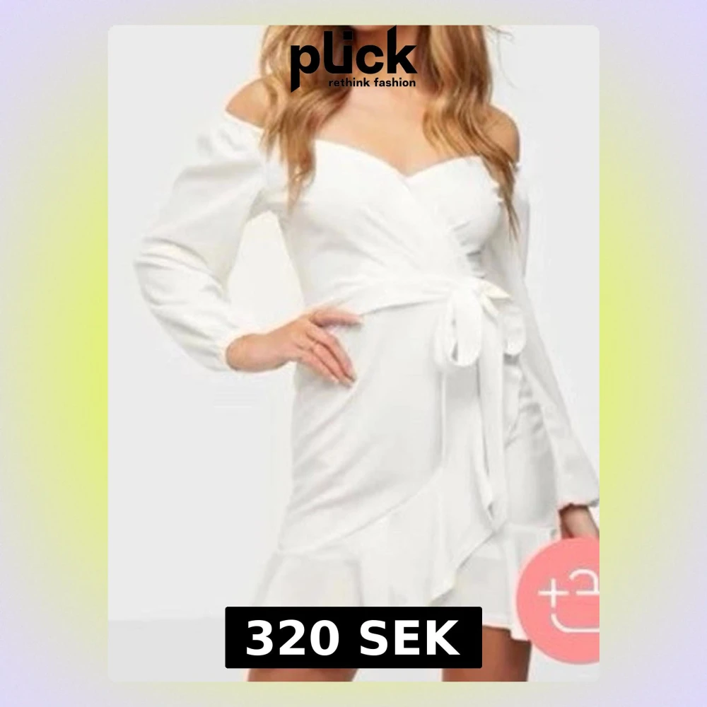 Snygg vit kort omlottklänning med volangdetaljer och knyt i midjan. Klänningen har långärmade ärmar och en v-ringad hals. Perfekt för dig som vill ha en fräsch och trendig look. Endast använd 1 gång, men annars i bra skick.❤️