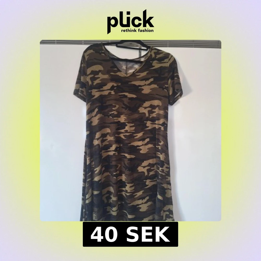 Säljer en cool kortklänning med klassiskt camouflage-mönster i bruna och beige toner. Klänningen har v-ringad hals och korta ärmar, perfekt för dig som gillar streetstyle och vill sticka ut. Materialet känns mjukt och skönt mot huden.