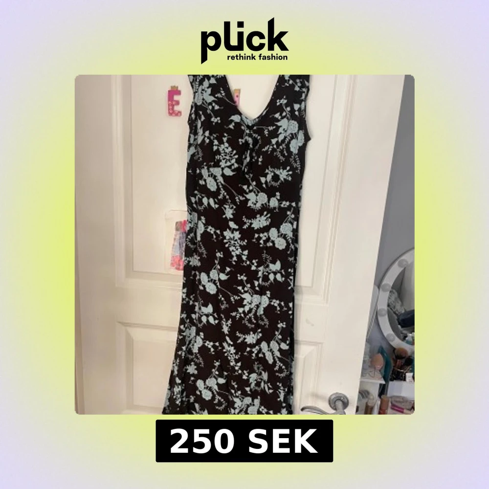 Snygg brun klänning med ljusblått blommönster. Den har en v-ringad design och knytning framtill. Perfekt för en somrig look!