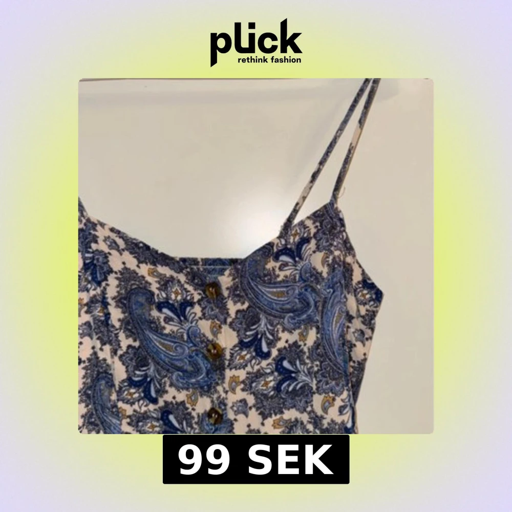 En sommarklänning med smala axelband och knappar framtill. Klänningen har ett paisley-mönster i blått och beige. Länden är till vaderna. Strl 40 men uppskattar den mer till strl 38.