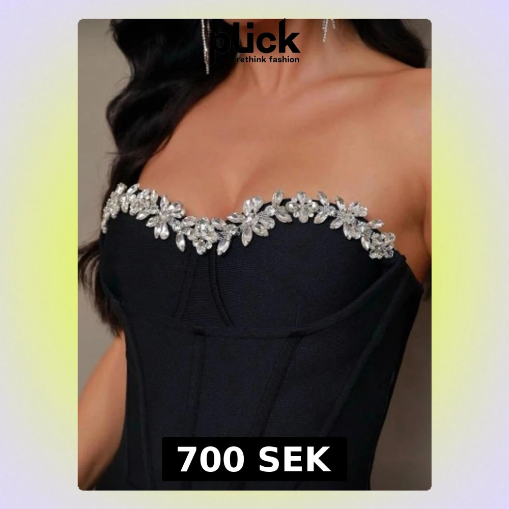 Elegant svart axelbandslös klänning med figurnära passform och dekorativa strassdetaljer längs överkanten. Klänningen har en klassisk, lång siluett och är perfekt för dig som vill sticka ut med en lyxig och stilren look.