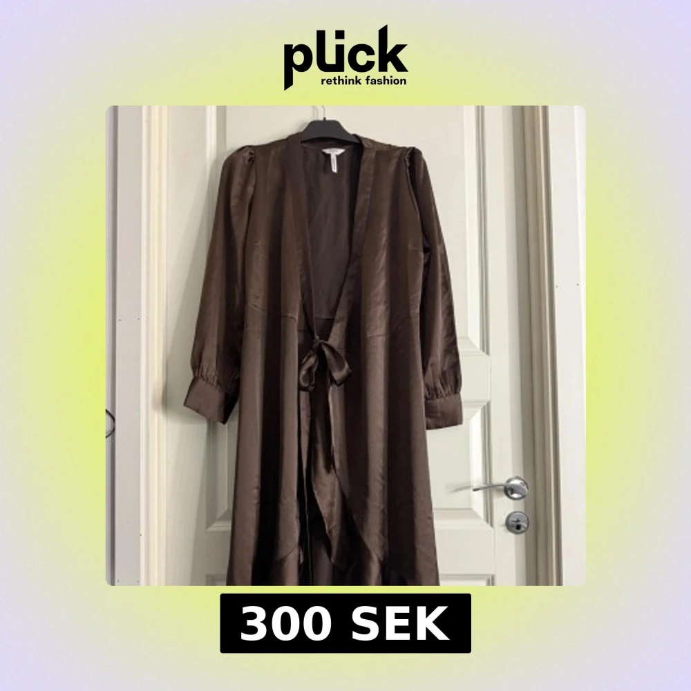 Säljer en brun långklänning med omlottknytning i midjan och volangdetaljer nertill. Klänningen har långa ärmar med lätt puff och är tillverkad i ett glansigt, mjukt material som ger en elegant känsla.