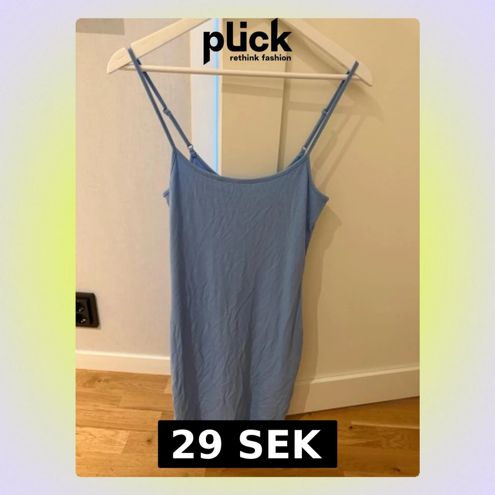 Säljer en ljusblå ribbad klänning med smala justerbara axelband.