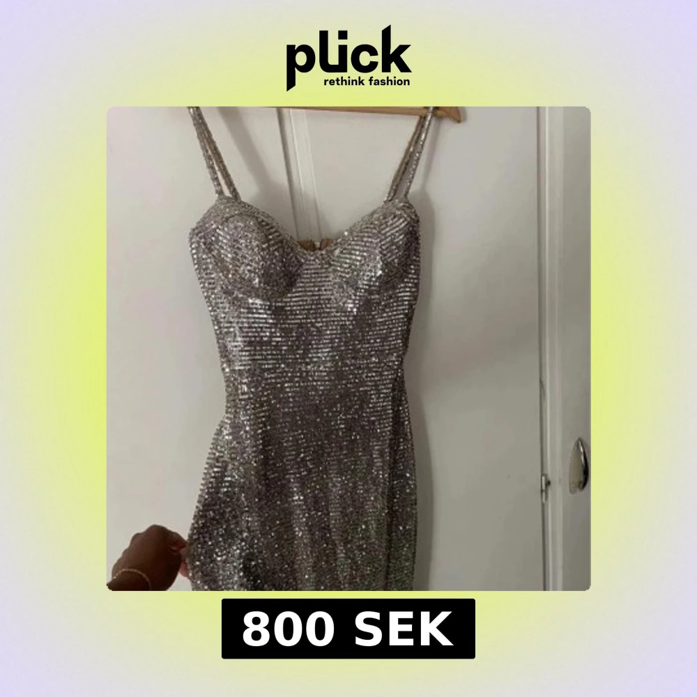 Säljer en maxad långklänning i silver med glittriga paljetter över hela klänningen. Den har smala axelband, markerad byst och en snygg slits framtill. Perfekt för dig som vill sticka ut och glänsa på festen. Klänningen är figurnära och har en öppen rygg.