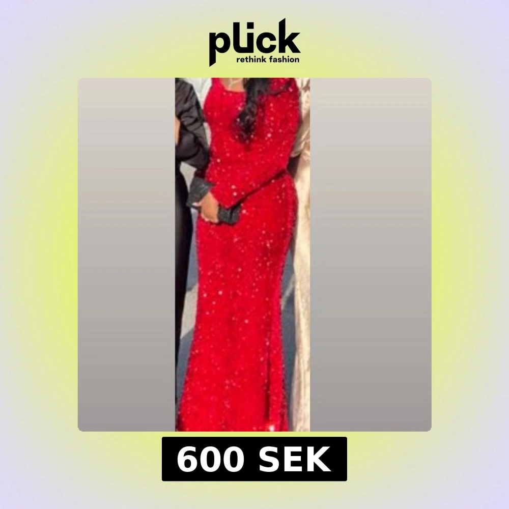 Säljer en röd långklänning med glittriga paljetter över hela klänningen. Klänningen har lång ärm och figurnära passform som framhäver siluetten. Perfekt för bal eller festliga tillfällen när du vill sticka ut och glänsa.