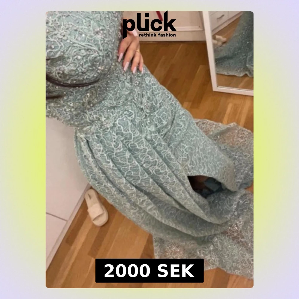 Elegant ljusblå långklänning med vackra spetsdetaljer och glittriga inslag. Klänningen har figurnära passform upptill och faller snyggt ned mot golvet. Perfekt för bal eller festliga tillfällen. Axelbandslös design som framhäver axlarna.