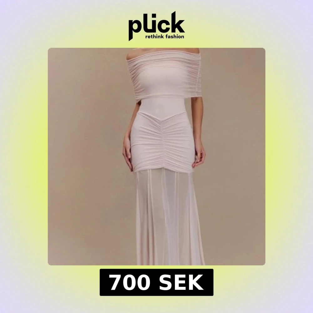 Superfin ljusrosa långklänning med offshoulder och transparent nederdel. Klänningen har rynkade detaljer över byst och höft, samt en figurnära passform som framhäver siluetten. Tillverkad i ett tunt, stretchigt material som ger en elegant look.