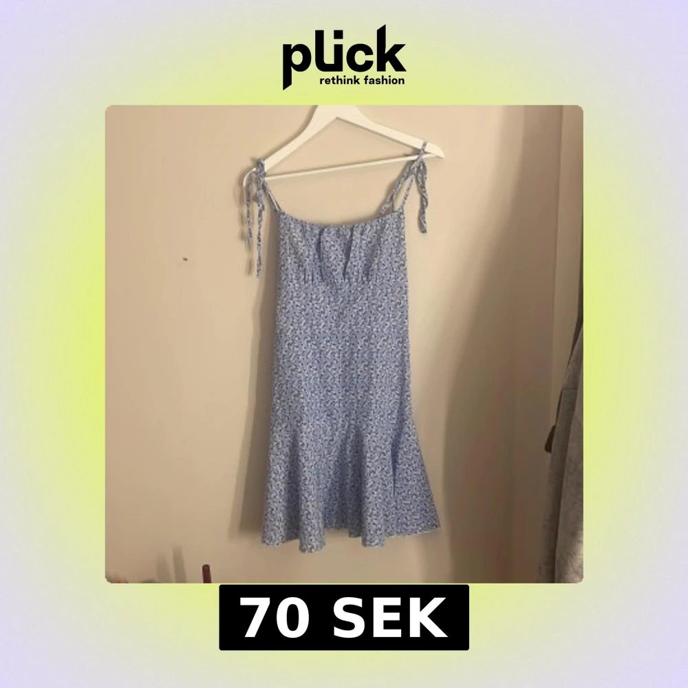 Supersöt blå kortklänning med vita små blommor och knytbara axelband. Klänningen har en lätt utsvängd nederdel och romantisk vibe, perfekt för varma dagar. Tunn och luftig, med volangkant nedtill och smickrande passform.