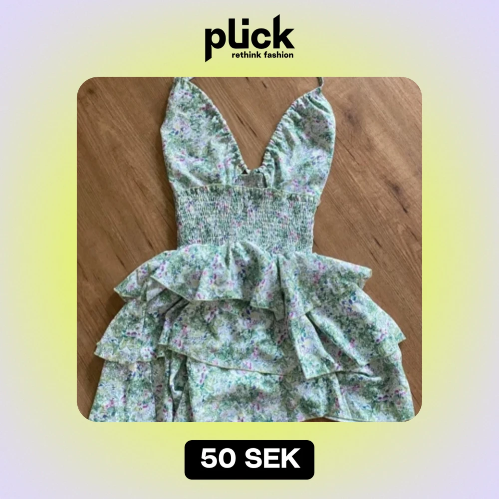 Säljer en superfin grön klänning med blommigt mönster. Den har smala axelband och en v-ringad urringning. Klänningen är kort och har flera lager av volanger som ger en härlig sommarkänsla. Perfekt för sommarens alla fester!