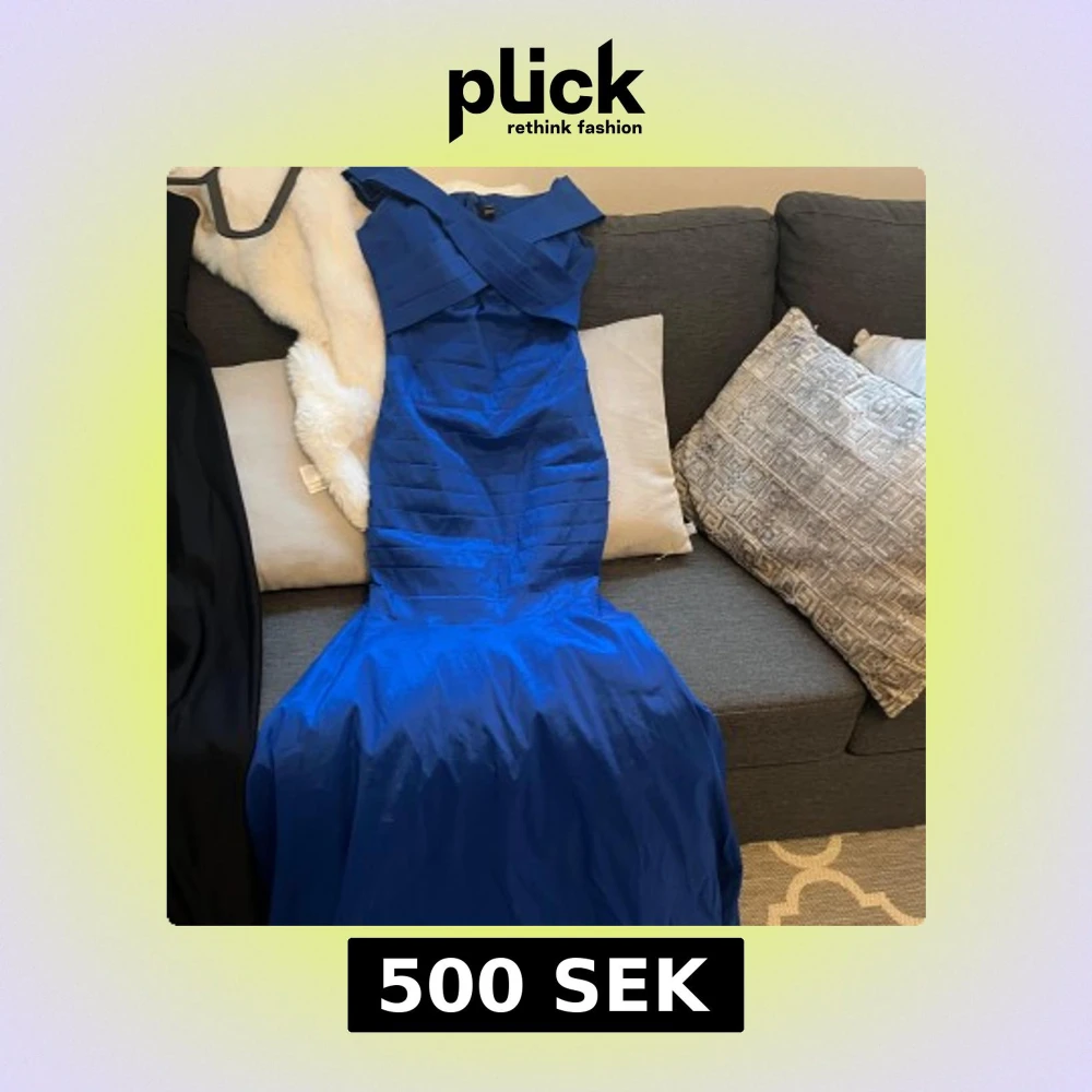 Jag säljer en blå vintage klänning som är tajt hela vägen till knäna och går ut där nere. Storlek M . formar kroppen jättefint