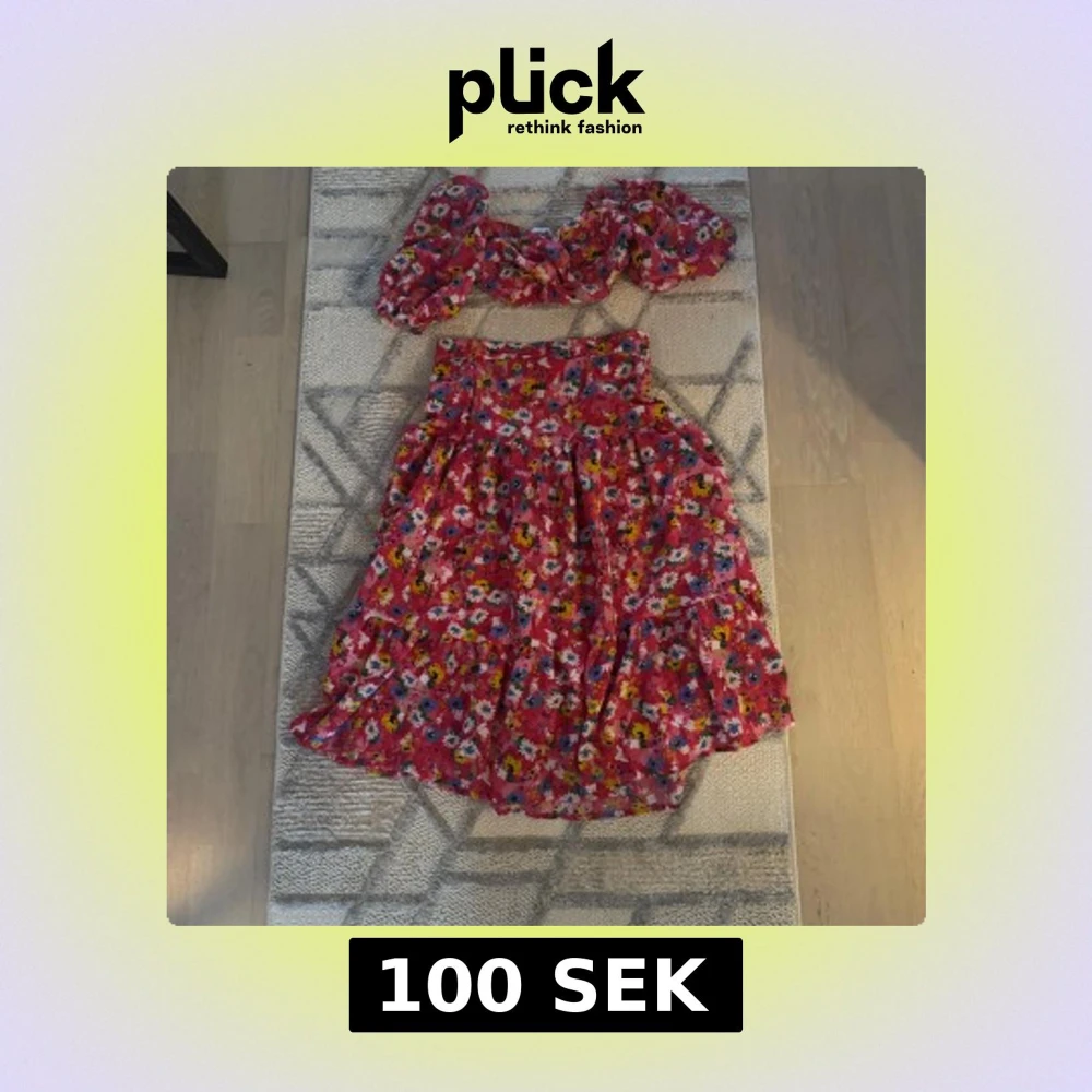Säljer en färgglad blommig kjol med volang och hög midja. Kjolen är i en härlig rosa nyans med små blommor i blått, gult och vitt. Matchande puffig topp ingår. Perfekt för sommarens alla tillfällen!