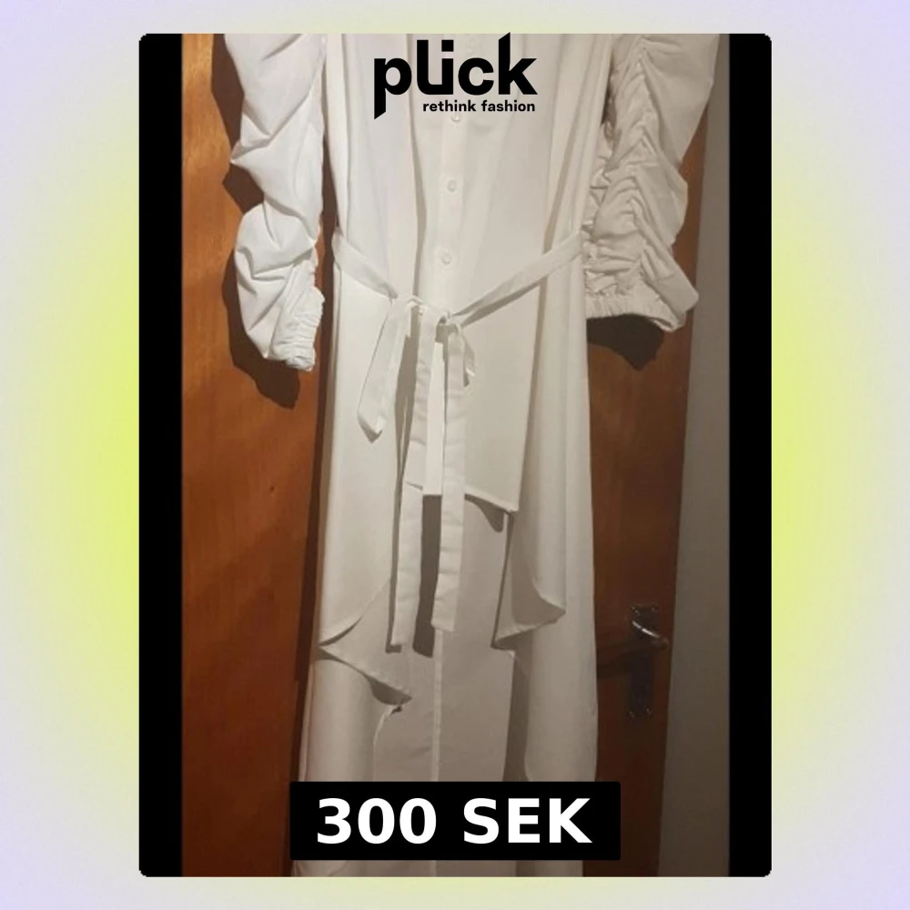 Säljer en vit långklänning med knappar framtill, puffiga långärmar och ett matchande bälte i midjan. Klänningen har en asymmetrisk nederdel och snygga detaljer vid ärmarna som ger extra volym. Perfekt för dig som vill sticka ut med en unik look.