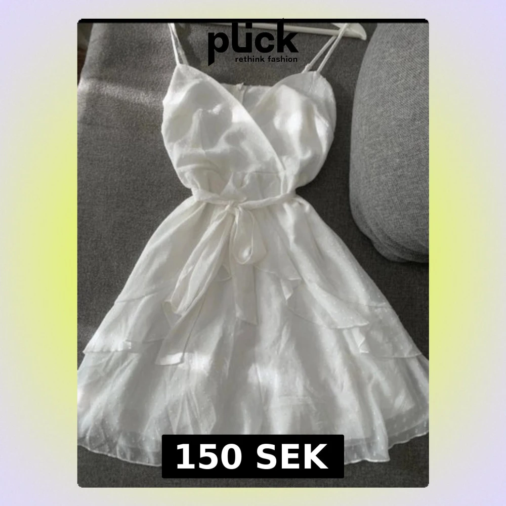 Söt vit klänning med tunna axelband, omlottliv och knytband i midjan.