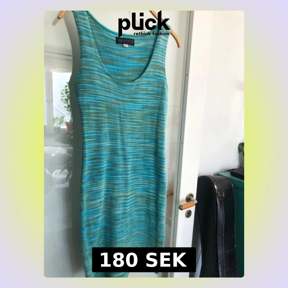 Säljer en stickad klänning från Ambra i blåa och gröna toner med smala ränder. Klänningen är ärmlös, har rund halsringning och är figurnära.