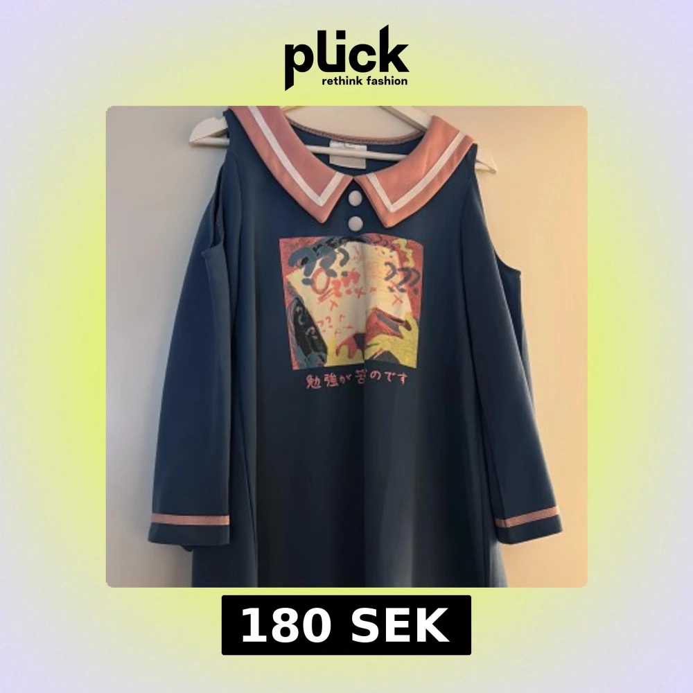 Unik blå kortklänning/tunika med rosa sailor-krage och vita detaljer. Långärmad modell med cold shoulder och tryck framtill i pastellfärger samt japansk text. Snygga knappar vid halsen och rosa kantband på ärmar och nederkant. Perfekt för dig som gillar kawaii-stil! Den är storlek M men passar mer som en storlek S. Den passar perfekt som en tunika med en söt kol under!!<3
